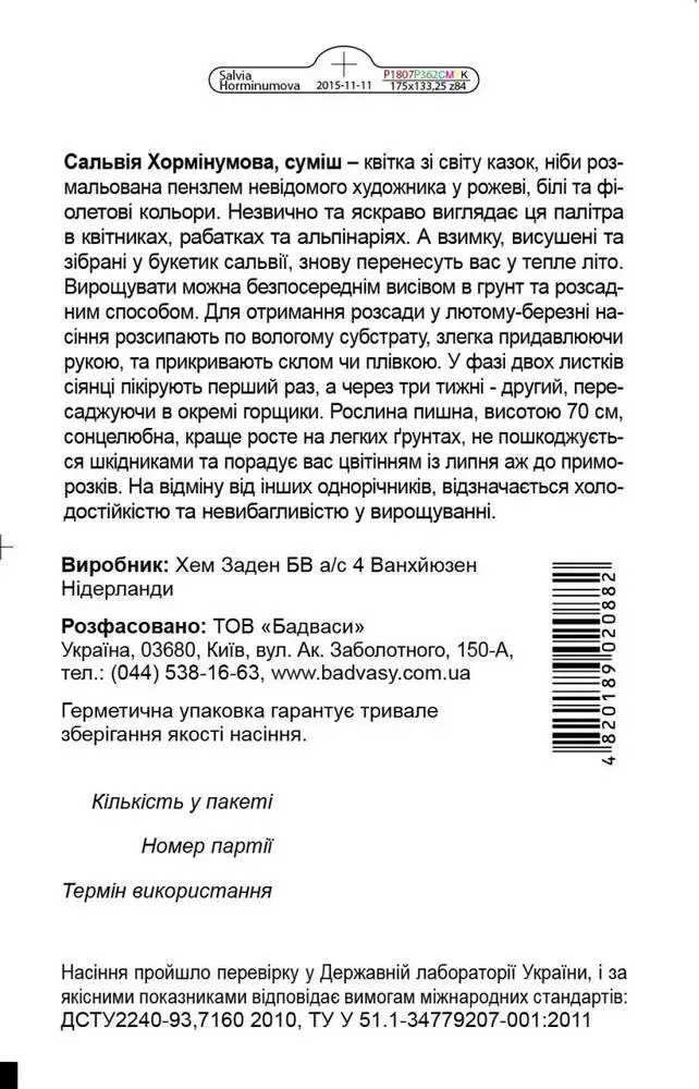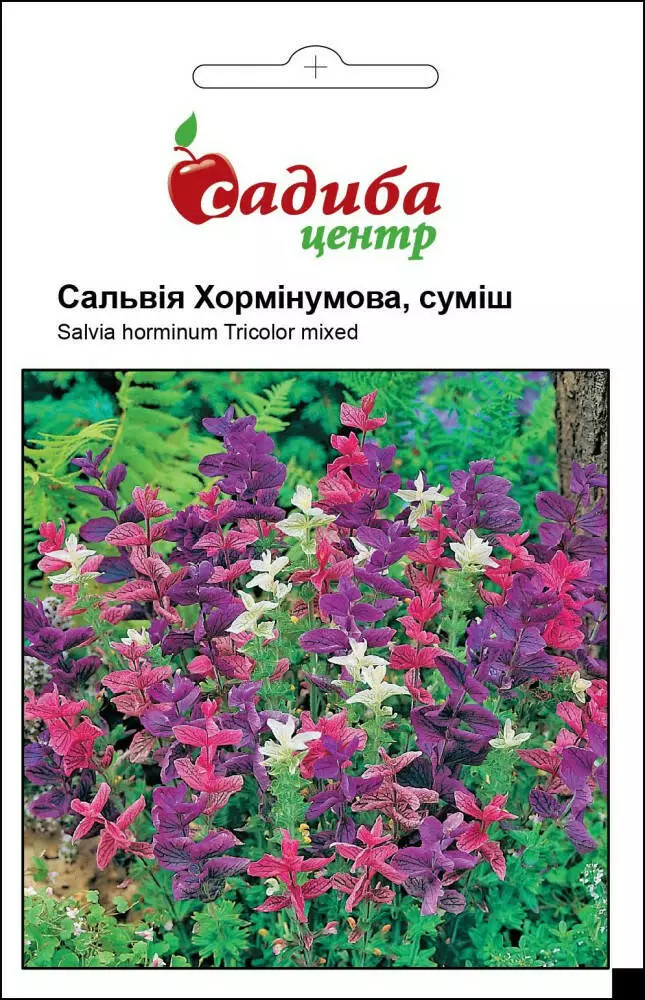 Сальвія Хормінумова, суміш – чарівна, дещо екзотична, казкова рослина. Неповторна краса цієї квітки, ніби розмальованої рукою невідомого художника у рожеві, білі та фіолетові кольори. Як незвично та яскраво виглядає палітра соковитих кольорів в композиціях, вона буде доречною на квітниках, рабатках та альпінаріях. А взимку, зібрані у букетик сальвії, знову перенесуть Вас у тепле літо. Вирощувати можна безпосереднім висівом в грунт та розсадним способом. Для отримання розсади у лютому-березні насіння розсипають по вологому субстрату, злегка придавлюючи рукою, та прикривають склом чи плівкою. У фазі двох листків сіянці пікірують перший раз, а через три тижні - другий, пересаджуючи в окремі горщики. Рослина пишна, висотою 70 см, сонцелюбна, краще росте на легких ґрунтах, не пошкоджується шкідниками та порадує вас цвітінням із липня аж до заморозків. На відміну від інших однорічників, відзначається холодостійкістю та невибагливістю у вирощуванні.
