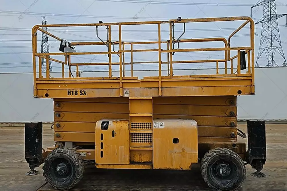 Ножичний підіймач б/в Haulotte H18SX 4x4, 2015 р/в, з напрацюванням 2898 м/г. Двигун — 24 кВт. Габаритна висота — 3 м. Висота підйому — 18 м. Вантажопідйомність — 500 кг. Вага — 7300 кг. Розмір шин: 10-16,5. Додаткові висувні секції – 2 шт.