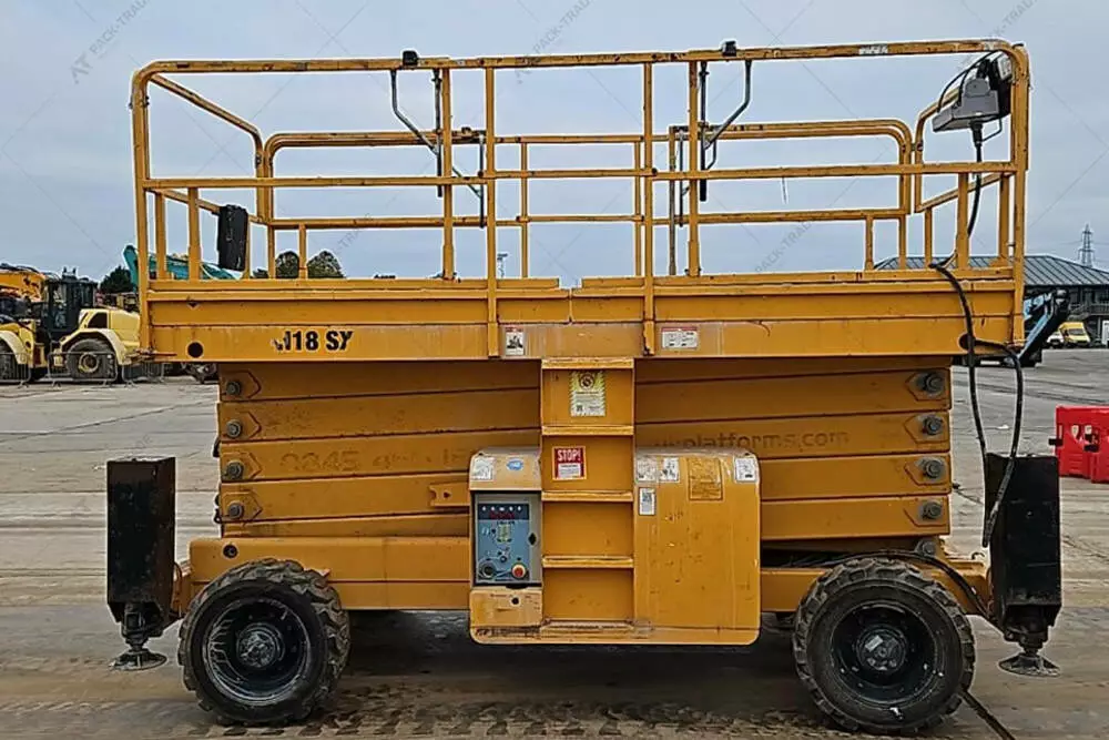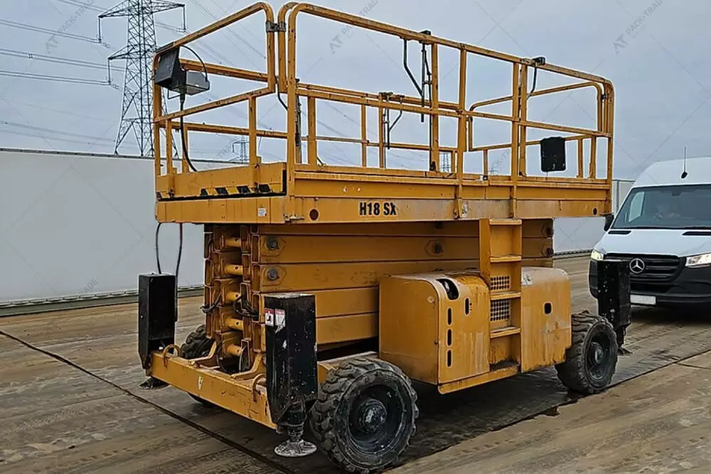 Ножичний підіймач б/в Haulotte H18SX 4x4, 2015 р/в, з напрацюванням 2687 м/г. Двигун — 24 кВт. Габаритна висота — 3 м. Висота підйому — 18 м. Вантажопідйомність — 500 кг. Вага — 7300 кг. Розмір шин: 10-16,5. Додаткові висувні секції – 2 шт.