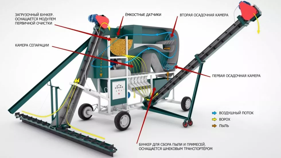 При використанні сік- 25 купу не потрібно подавати в завантажувальний бункер транспортерами. Машина підкочується до вороху, підбирає його і акуратно сортує по фракціях: зерно за трьома категоріями окремо, незернові відходи, пил і сміття окремо в спеціальний контейнер для сміття.