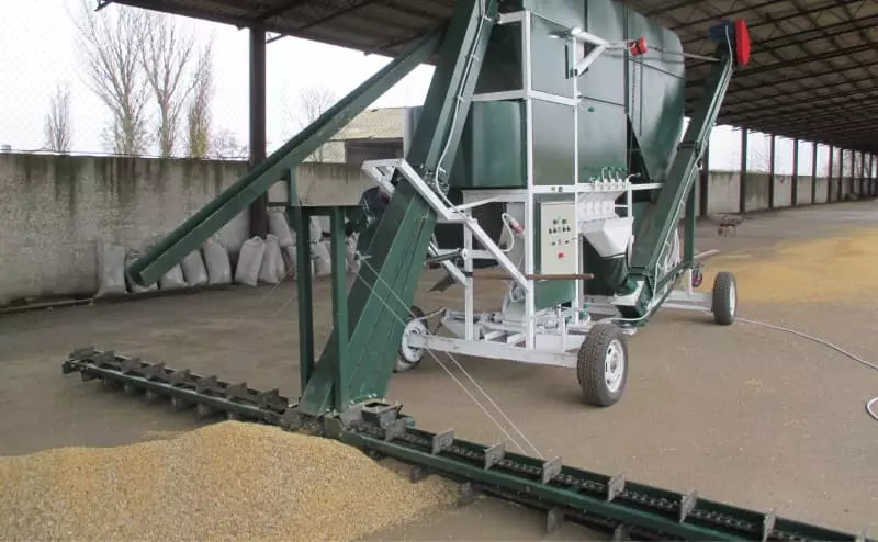 На виході з машини откалиброванное зерно можна подавати на будь-яку висоту до 4,3 метрів або буртовать з будь-якого боку від машини там, де потрібно. При буртовке регулювання висоти подачі зерна дозволяє вберегти зерно від травмування.