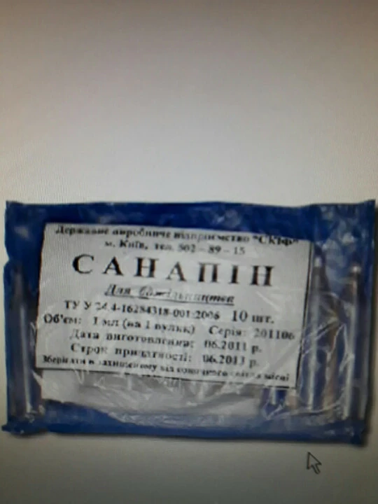 Санапін (Sanapinium) - прозора рідина з незначним жовтуватим відтінком, можливий незначний осад. На відкритому повітрі швидко перетворюється на газо-аерозольний стан (парит). Горючий.