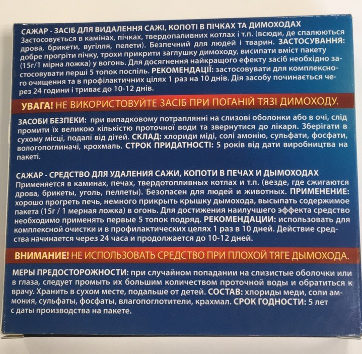 Применение: хорошо прогреть печь, немного прикрыть крышку дымохода, высыпать содержимое пакета (15г/ 1 мерная ложка) в огонь. Для достижения наилучшего результата средство необходимо применять первые 5 топок подряд.