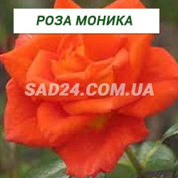 Monika – дуже яскрава червоно-жовта чайно-гібридна троянда. Квітки найбільш яскраві коли тільки починають розпускатися. Яскраво-оранжево-червоні пелюстки контрастують з жовтим виворотом. Коли квітка повністю розпуститься, вона стає не такою яскравою, і жовтий контраст втрачається. Квітки з'являються зазвичай по одному, на дуже довгих пагонах, завдяки чому сорт підходить для зрізання. Листя темне, блискуче, стійке до хвороб, кущ високий, прямостоячий, у спекотному кліматі досягає 2 м, але зазвичай при обрізанні не перевищує 1 м. У Monika дуже довгі елегантні бутони, які розпускаються в красиві квітки яскравого яскраво-червоного кольору із золотою основою. Це насичене фарбування добре тримається і не вигоряє. Квітки з'являються зазвичай по одному на довгих пагонах, завдяки чому сорт добре підходить для зрізання. /img/user-files/tsvetok-chayno-gibridnoy-rozy-monika.jpg" />