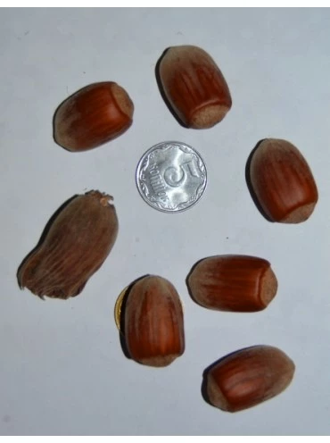 Плоды: однородные, продолговатой формы, завязываются большими пучками. Скорлупа средней толщины, блестящая с темными полосами, с бронзовым отливом. Плоды отличаются хорошим, слегка сладковатым вкусом, а ядро почти полностью заполняет скорлупу. 100 шт. орехов составляет около 400-450г (см. фото).