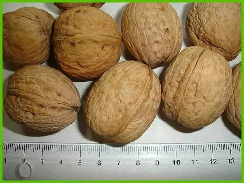 • Грецкий орех этого вида ценен отличными вкусовыми качествами и наличием полезных веществ и витаминов. В 100 г ядра содержится белков в среднем 16%, жиров – 73%, сахаров – 7-9%, органических кислот – 0,5%, пектинов – 0,4-1%, витамина С – 2,9-4,6%, дубильных веществ – 1,3%.