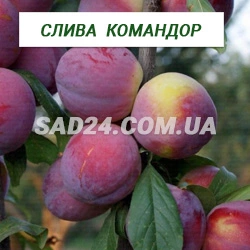Колоноподібна злива сорту Командор у висоту може досягати максимально 2 метри. Урожайність дерева висока, яка обумовлюється наявністю коротких список і кільчаток, що в момент дозрівання густо обліплені плодами. Урожай повністю дозріває приблизно до середини літа. Відрізняється сорт та розмірами плодів. В середньому одна злива має вагу 50-55 г. Сливи мають овальну або еліптоїдну форму, шкірка щільна фіолетового кольору. М'якуш у злив жовтого кольору, який дуже соковитий і на смак солодкий з невеликою освіжаючою кислинкою. Усередині плодів знаходиться невелика кісточка, яка без проблем відокремлюється від м'якоті. Сливи цього сорту придатні для вживання у свіжому вигляді, а також для приготування консервації. " />