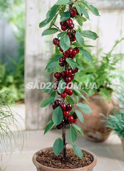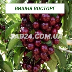 Вишня Захоплення – новий голландський сорт колоноподібної форми вишні. Дуже популярний серед садівників завдяки компактній формі крони. Плоди великі масою 10-15 г, темно-червоного кольору. М'якуш рожевий, соковитий, солодкий. Термін дозрівання - середньоранній. Плодоношення настає на другий третій рік після посадки. Дерево середньоросле, росте до 2 м з вузькопірамідальною формою крони. Особливості сорту: сорт морозостійкий, але може ушкоджуватися весняними заморозками. Стійкість до хвороб та шкідників висока. Вишня є самобезплідним деревом, тому висаджувати потрібно в парі з колоноподібними або звичайними сортами вишень або черешень схожого терміну дозрівання. Для якісного запилення відстань між деревами не повинна перевищувати 10 метрів. -Vostorg.jpg" />