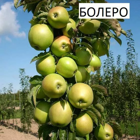 Колоноподібна яблуня "Болеро" - цей сорт яблунь виростає лише 50 см завширшки, 2 м заввишки. Не дають сильних бічних пагонів. Що дозволяє одержати непоганий урожай яблук на дуже вузькому просторі. Самозапильна рослина, але з використанням інших сортів досягає помітно вищого врожаю. Термін дозрівання – пізній (середина – кінець вересня).