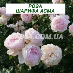 Квітка плетистої троянди Шарифа Асма Одна з найкрасивіших англійських троянд, але може пошкоджуватися занадто спекотним сонцем. Приємний запах із фруктовими нотами, нагадує білий виноград та шовковицю. Дуже красива троянда. З'являються у невеликих щільних кистях, зазвичай по 3-4 шт. Листя велике, стійке до хвороб, кущ колючий, невисокий, прямостоячий, з жорсткими пагонами. Цвіте хвилями.