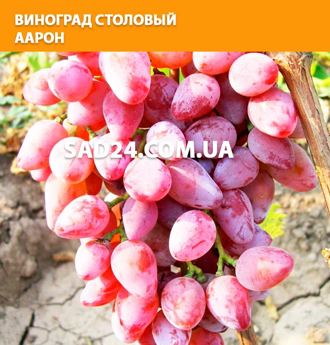 Аарон столова гібридна форма винограду. Характеризується супер ранніми термінами дозрівання 105 - 110 днів, підвищеною морозостійкістю до - 25°С, високою врожайністю. Лоза з великою силою зростання, визріває добре. Квітка двостатева. Кетяги дуже великі, масою 700-1200 р., конічної форми середньої щільності. Ягоди великі, масою 10-12 р., розміром 30х25 мм, овальної форми, червоного забарвлення. Шкірка тонка, при їді не відчувається, сорт транспортабельний. М'якуш соковитий, приємного сортового смаку. Накопичення цукру до 26%. Оптимальне навантаження на кущ 30-35 очок. Обрізка лоз плодоношення проводиться на 6-8 очків або на 3-4 вічка. Стійкість до захворювань підвищена.