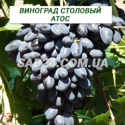 Атос - гібридна форма. Форма понад ранній термін дозрівання, від початку розпускання нирок до повної зрілості 95-100 днів. Дозрівають на початку серпня. Пагони вищі за середню силу зростання. Дозрівання лози високе, майже 100%. Живці укорінюються дуже добре. Квітка двостатева Грона конічна, дуже велика, середньої щільності. Ягоди великі, масою до 12г, одного розміру, овально-соскоподібні або пальчикові, шкірка чорного кольору. М'якуш м'ясисто-соковитий, хрумкий, сортового смаку. Шкірка ягід середньої товщини при їжі не відчувається. Навантаження рослини вічками 30-35. Форма чуйна на помірний полив. Навантаження рослини пагонами – 22-24, при площі живлення рослини 4-6м2.. Обрізка лоз плодоношення середня -; на 6-8. Морозостійкість вища за середню. Стійкість до мілдью висока – 7 балів, до сірої гнилі висока – 7 балів, оідіуму висока – 7 балів.