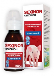 Сексінон для свиней (розчин для перорального застосування) Опис Масляниста рідина від світло-сірого до світло-жовтого кольору із специфічним запахом. Склад 1 мл препарату містить діючу речовину: мегестролу ацетат 5 мг. Фармакологічні властивості АТС vet QG03AC05, Мегестрол. Мегестролу ацетат - синтетичний прогестаген, що впливає на гіпоталамо-гіпофізарну систему тварини і блокує виділення гонадотропних гормонів (фолікуло-стимулюючого та лютеїнізуючого). При нестачі цих гормонів у крові затримується дозрівання фолікулів в яєчниках самок, а у самців блокується синтез тестостерону, внаслідок чого припиняється тічка та статевий потяг у тварин. У свиней мегестрол знижує статеву активність та пов'язану з нею поведінку. Механізм дії мегестролу ацетату має два основні напрямки впливу на організм: антигонадотропна активність проявляється у пригніченні секреції гонадотропних гормонів та затримці овуляції, яка клінічно є наслідком затримки тічки; прогестагенна дія полягає у прямому впливі на ендометрій матки, який активізує секреторну фазу, що пригальмовує імплантацію зародка, посилюючи контрацептивні властивості препарату. Застосування Перорально для свинок (для синхронізації статевої охоти), з метою попередження або припинення тічки. Дозування Перорально з кормом або примусово безпосередньо на корінь язика: - для попередження тічки ? 1мл на 10 кг маси тіла 1 раз на 20-25 діб. Після припинення застосування препарату тічка настає через 30-31 добу; - при синхронізації статевої охоти після застосування препарату одночасна тічка настає через 30-31 добу; Протипоказання Не застосовувати препарат при захворюваннях сечостатевої системи, пухлинах, нестатевозрілим, вагітним та лактуючим тваринам. Не рекомендується застосовувати препарат, якщо після настання тічки пройшло більше 3 діб, та молодняку тварин в першу тічку через труднощі визначення початку циклу. Застереження Забій свиней на м'ясо дозволяється через 14 діб після останнього застосування препарату. Отримане до зазначеного терміну м'ясо утилізують або згодовують непродуктивним тваринам, залежно від висновку лікаря ветеринарної медицини. При тривалому використанні препарату можлива зміна характеру, розвиток молочних залоз, збільшення апетиту і пов'язане з цим збільшення маси тіла тварини. Зберігання Сухе, темне, недоступне для дітей місце при температурі від 5?С до 25?С. Не зберігати разом з харчовими продуктами, напоями та кормами для тварин. Термін придатності - 2 роки з дати виготовлення. Для застосування у ветеринарній медицині! Аналогів немає.