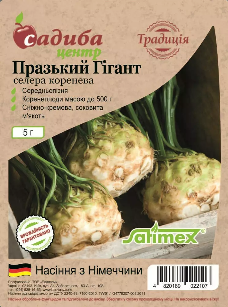 Празький гігант - відомий урожайний сорт кореневої селери. Коренеплоди округлі, масою до 500 г, з ніжно - кремовою, соковитою та ароматною м’якоттю. Селеру споживають у свіжому вигляді, як основну страву та використовують у якості приправи.