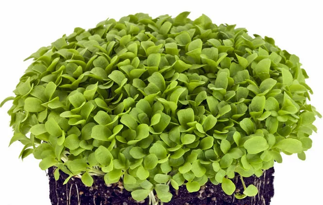 Зеленые островатые ростки с пряным ароматом. Содержат эфирные масла, витамины А, Р, В2, С, каротин, рутин и фитонциды. Молодые листочки добавляют в свежие салаты, овощные супы, в гарниры и украшают все блюда. Микрозелень базилика имеет антисептическое и противовоспалительное действие, укрепляет стенки сосудов, помогает нормализовать вес.