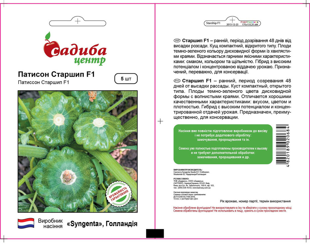 Старшип F1 — ранній високоурожайний гібрид патисону темно-зеленого кольору. Забезпечує високий вихід товарної продукції. Має тривалий період збирання врожаю.