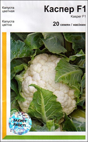 Для тих, хто воліє вирощувати овочі власноруч, при бажанні отримати хороші плоди цвітної капусти, виникає питання вибору насіння. Звертаємо вашу увагу на прекрасний сорт – Каспер. Гібрид капусти, отриманий селекційним шляхом, має надзвичайну витривалість і підійде як для літнього, так і для осіннього вирощування. Цвітну капусту Каспер можна споживати у свіжому вигляді, також цей сорт підходить для переробки, консервації і заморожування.
