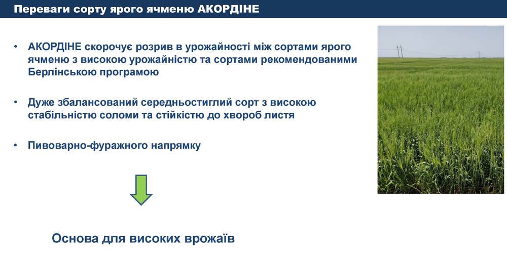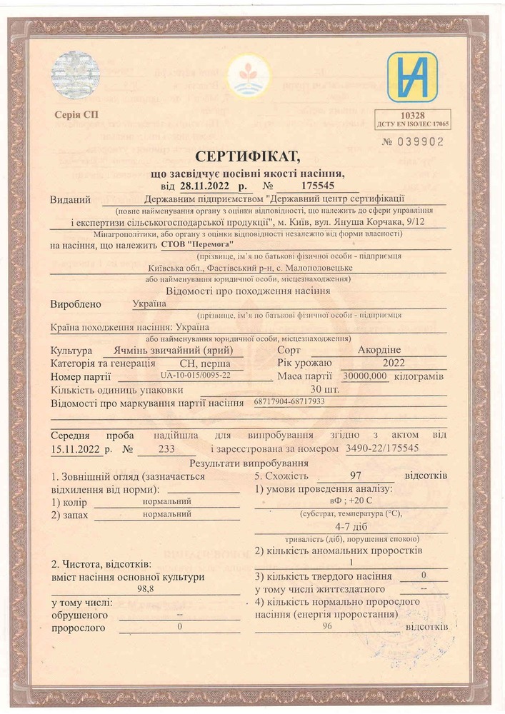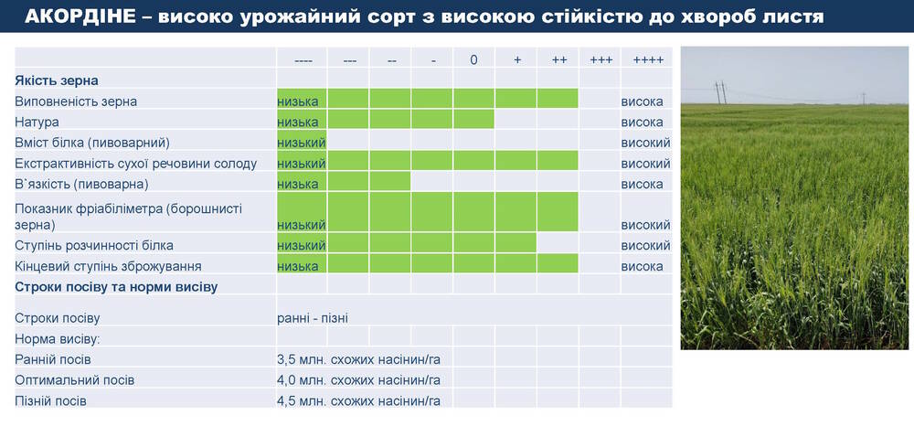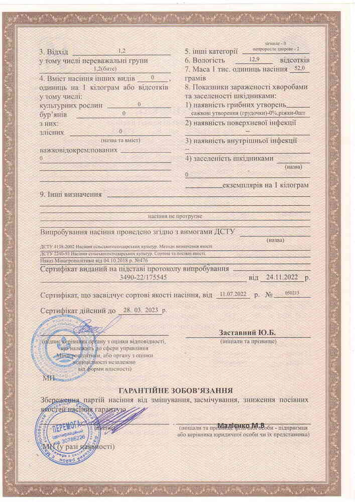 Урожайність сорту у СТОВ Перемога складає 60 ц/га. Тривалість