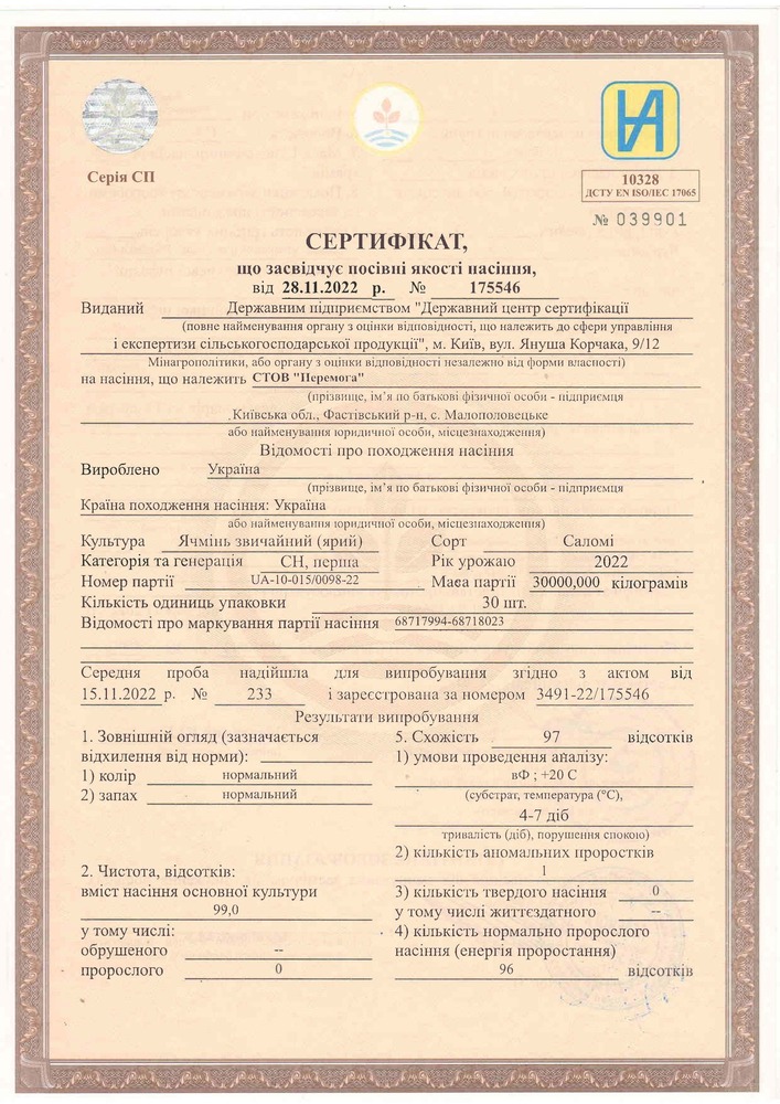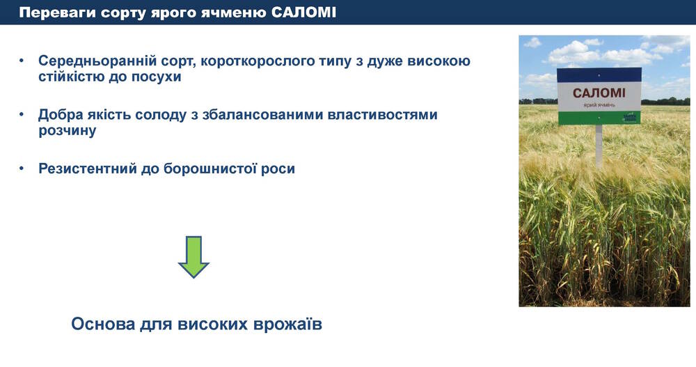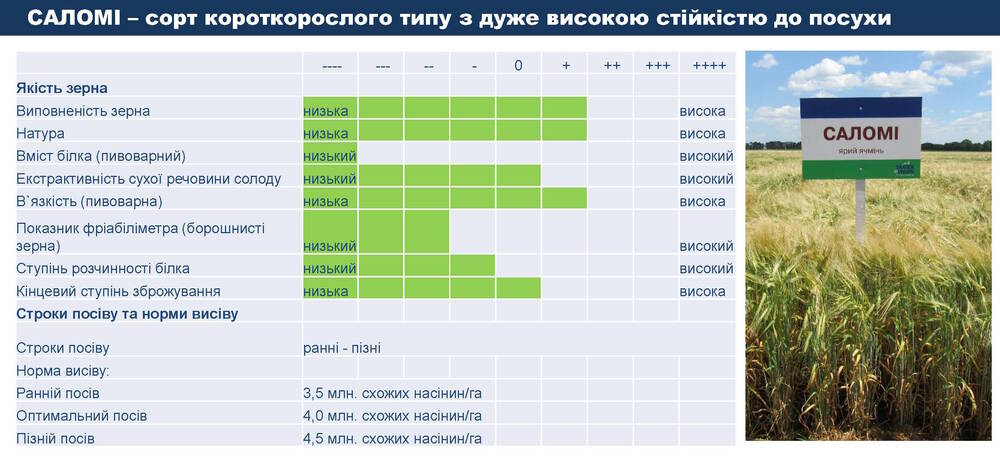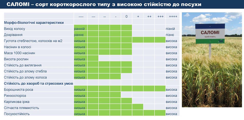 Ознаки сорту: нижні листки – опушення піхви відсутнє; остюки: забарвлення кінчиків наявне; колос: кількість рядів два; довжина волосків основні щетинки – короткі; опушення вентральної борідки відсутнє; тип розвитку ярий.