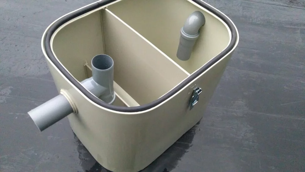 Жироуловители оснащают сифоном, который удерживает в устройстве жиры. Содержащие жиры сточные воды, сначала направляются в дефлектор сепаратора, который снижает скорость потока и равномерно распределяет поток.