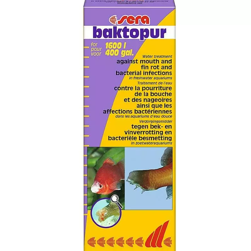 Засіб SERA BACTOPUR має дезінфікуючий ефект, надає м'яку лікувальну дію на рибку, допомагає їй швидко повернути здоров'я. Розраховано на застосування у випадках, коли у рибок виявляються ознаки хвороби: плями від білого до сіро-білого кольору, місця на шкірі з синцями і здуттям, що кровоточать запалення у заднього проходу і по краях плавців. Поразку луски та водянку очеревини можна впізнати по наповненою водою порожнини тіла, витріщеними очима і сильно відстовбурченими чешуйкам. Ватообразний наліт навколо порожнини рота, біло-сірі гнійники на голові і плавниках і неспокійне хвилювання на дні акваріума. Краї плавників побілілі або повністю розмочалені, аж до повного руйнування структури. SERA BACTOPUR повністю усуває збудників хвороби, повертає рибкам здоров'я і гарний зовнішній вигляд. Знижує ризики захворювання в подальшому. Засіб можна використовувати як ліки, так і для профілактики. Можна використовувати і як кондиціонер для акваріумної води. Представлено у вигляді рідкої, водорозчинної структури.