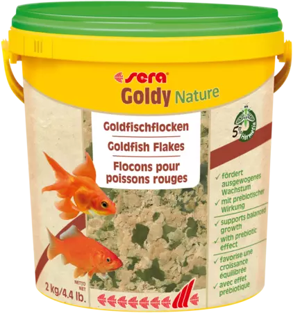 sera Goldy Nature - пластівці для здорового росту і приголомшливого кольору золотих риб, є основним кормом для невеликих золотих рибок та їх видів, таких як шубункіни, вуалехвости, комети а також інших холодноводних риб, що не містять барвників та консервантів.