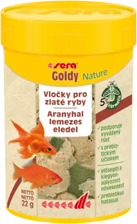 sera Goldy Nature - пластівці для здорового росту і приголомшливого кольору золотих риб, є основним кормом для невеликих золотих рибок та їх видів, таких як шубункіни, вуалехвости, комети а також інших холодноводних риб, що не містять барвників та консервантів.