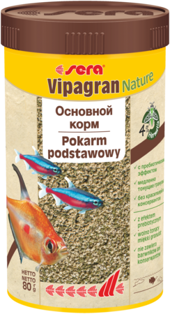 sera Vipagran Nature - основний корм, що складається з м'яких гранул із 4% борошна з комах, виготовлених без барвників та консервантів для всіх риб, що харчуються в середніх шарах води.