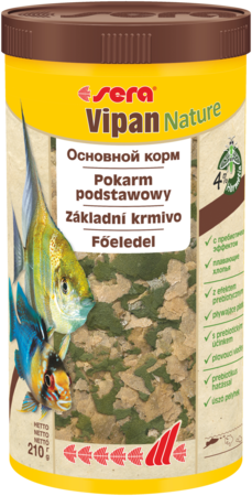 sera Vipan Nature - основний корм з 4% борошна з комах та пребіотичним ефектом, що складається з плаваючих пластівців без барвників і консервантів для всіх декоративних риб, що харчуються на поверхні води.
