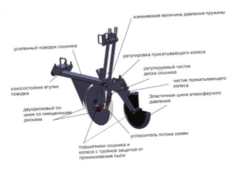 Задана глибина посіву насіння досягається за рахунок механізму притискних пружин, які крім регулювання глибини дозволяють механізму сошника копіювати поверхню площі, що засівається. Розташоване за сошником колесо, що прикочує-регулююче, підтримує чітке ведення глибини загортання насіння, забезпечує контакт посівного матеріалу з ґрунтом, необхідний для оптимального надходження вологи по капілярах, рівномірного формування кореневої системи та схожості.