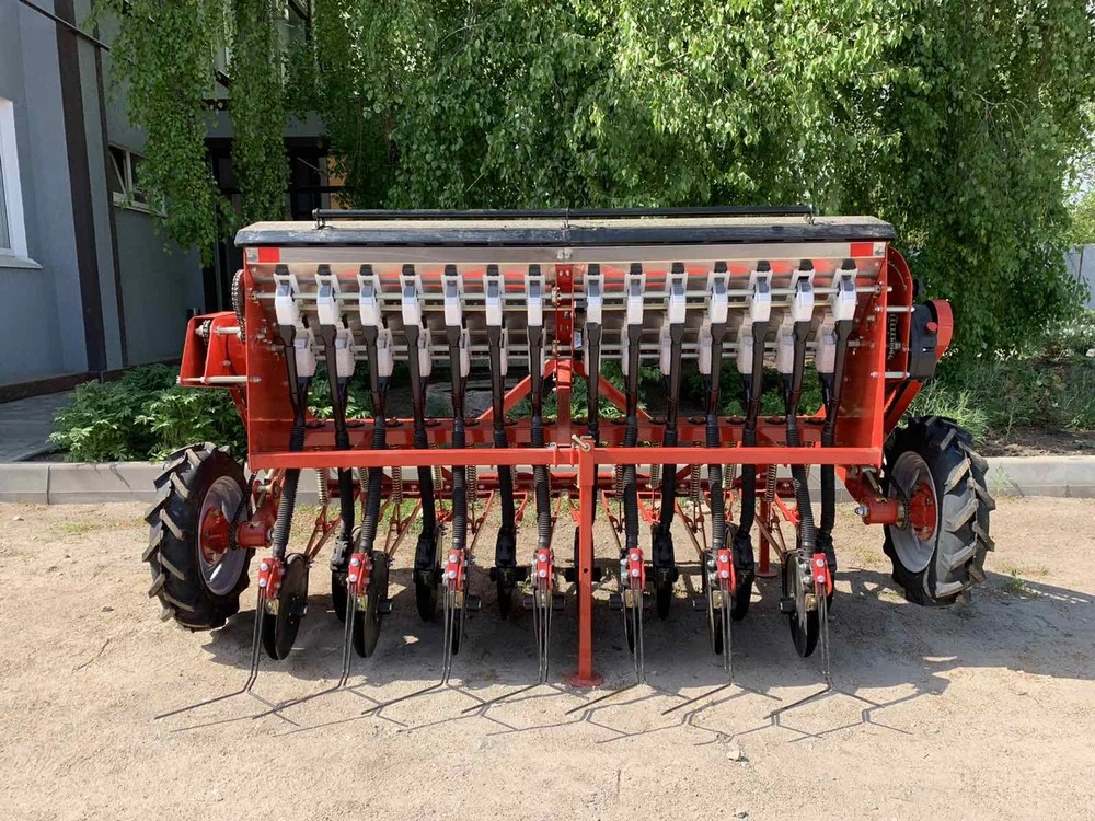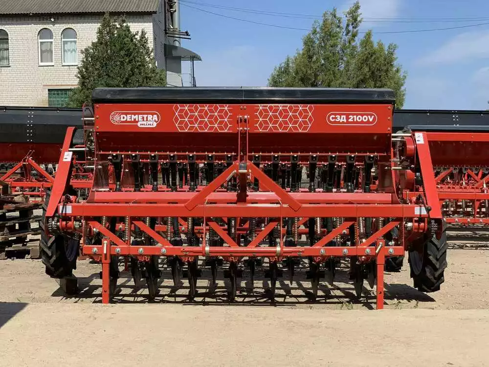 Сівалка зернотукова " ДЕМЕТРА МІНІ" 2100V, c безступінчастою коробкою передач(варіатор), призначена для рядового посіву зернових культур (пшениці, ячменю, жита, вівса), зернобобових (соя, горох, квасоля, нут, сочевиця, боби), дрібн , гірчиця, льон) сипучого та середньо сипучого насіння трав з одночасним внесенням мінеральних добрив.