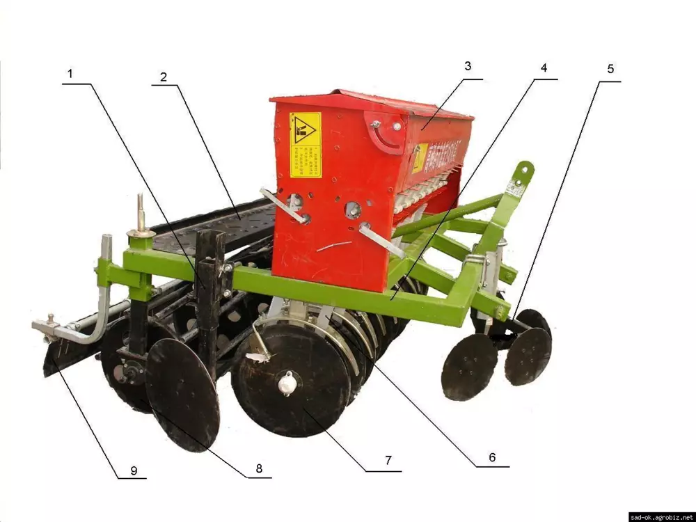 1.Маркер. 2.Подножка. 3.Бункер с высевающим аппаратом в сборе. 4.Рама. 5.Выравниватель. 6.Семяпровод. 7.Сошник. 8.Приводной каток. 9.Загортач.