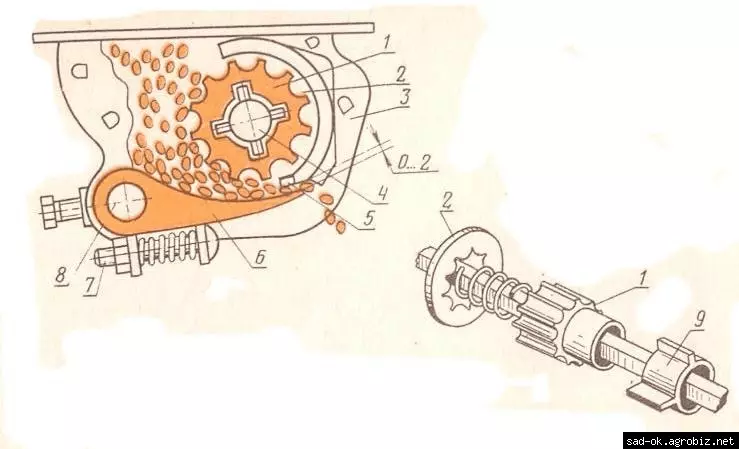 1.Катушка. 2.Розетка. 3.Семенная коробка. 4.Валик высевающего аппарата. 5.Ребро муфты. 6.Клапан. 7.Регулировочный болт. 8.Валик клапанов опорожнения. 9.Муфта.