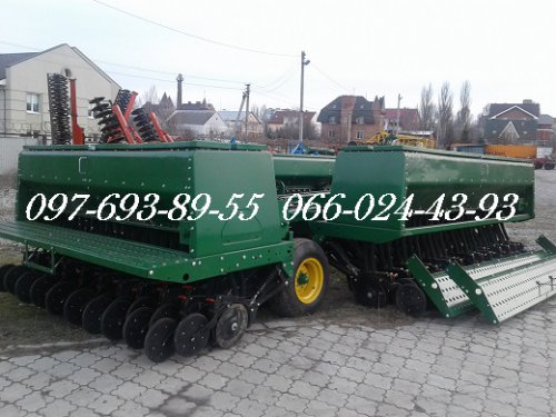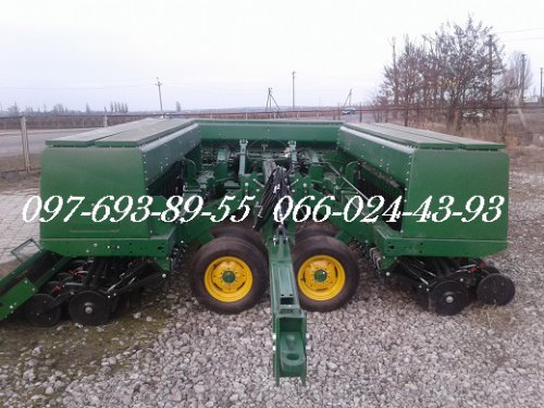Сівалка зернова механічна John Deere 455 б.у., Сівалка зернова John Deere 455, Сівалка John Deere 455, , передпродажна підготовка ( заміна втулок, встановлення нових висівних дисків і т.д.), сівалка у відмінному стані. Зернова сівалка John Deere 455 використовується для посіву зернових культур, при роботі як за мінімальною, так і за класичною технологією. Переваги сівалки моделі 455: ; 1. передні рами, що збираються вперед, дозволяють здійснювати транспортування вузькою дорогою; 2. розподільник посіву акуратно розподіляє насіння з бункера на готову борозну; 3. доступ подвійних дисків надає більш якісне проникнення у ґрунт. Система проникнення дозволяє знижувати тиск на ґрунт і легше пристосовується до поля; 4. гнучкість розпушувачів 33 см дозволяє їм копіювати контури ґрунту; 5. повністю гідравлічна складна система сівалки забезпечує легке та зручне транспортування. Сівалка механічна John Deere 455 обладнана секціями з дводисковими сошниками. При роботі диски обертаються, розрізаючи ґрунт та рослинні залишки і, як клин, розсувають ґрунт, утворюючи борозенку. Сошникові секції індивідуально підпружинені та радіально кріпляться до рами, що дозволяє незалежно копіювати рельєф та зберігати однакову глибину посіву. Глибина посіву насіння регулюється ступінчасто за допомогою коточка, що прикочує, індивідуально для кожної секції від 0 до 9 см з кроком 0,6 см. Проникнення дводискових сошників в грунт також забезпечується за допомогою гідравлічних циліндрів подвійної дії, що впливають на масивний брус рами. Сівалки випускаються з шириною міжряддя 15 см. Для висіву насіння та внесення добрив у бункері встановлені висівні апарати котушкового типу. Привід на висівні котушки передається від опорних коліс через ланцюгову передачу та шестерний редуктор. Норма висіву насіння регулюється за рахунок зміни робочої довжини котушки. Норма внесення добрив може встановлюватися в діапазоні від 4,5 до 116 кг/га та регулюється за рахунок зміни частоти обертання котушки за допомогою ступінчастого редуктора.