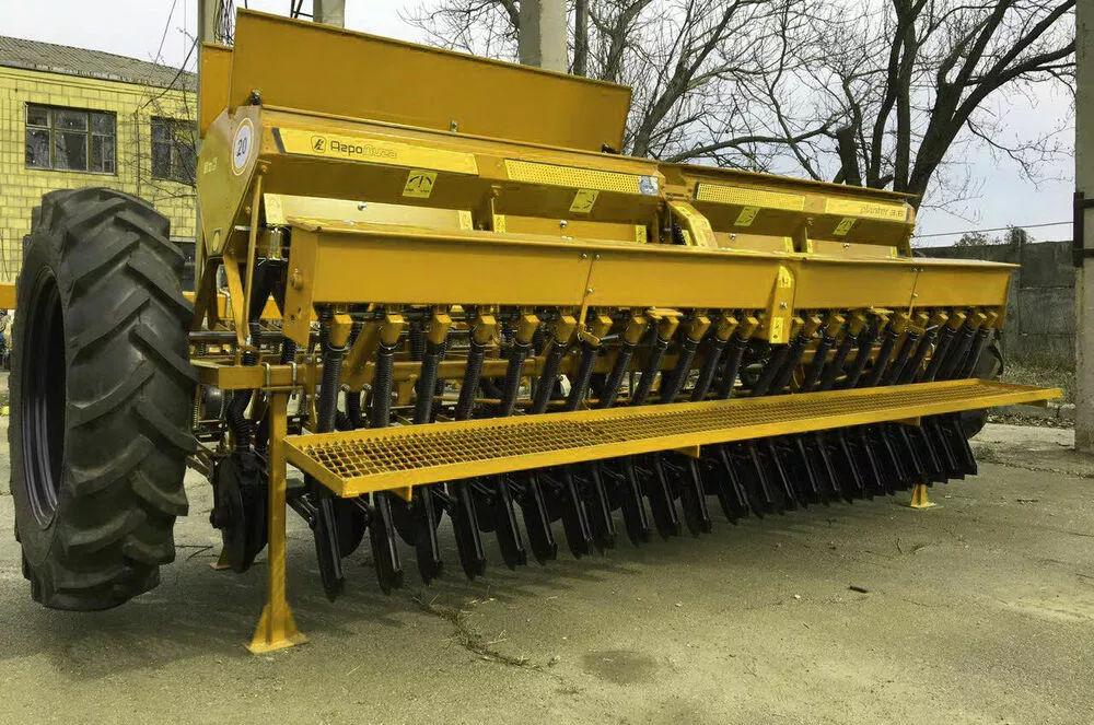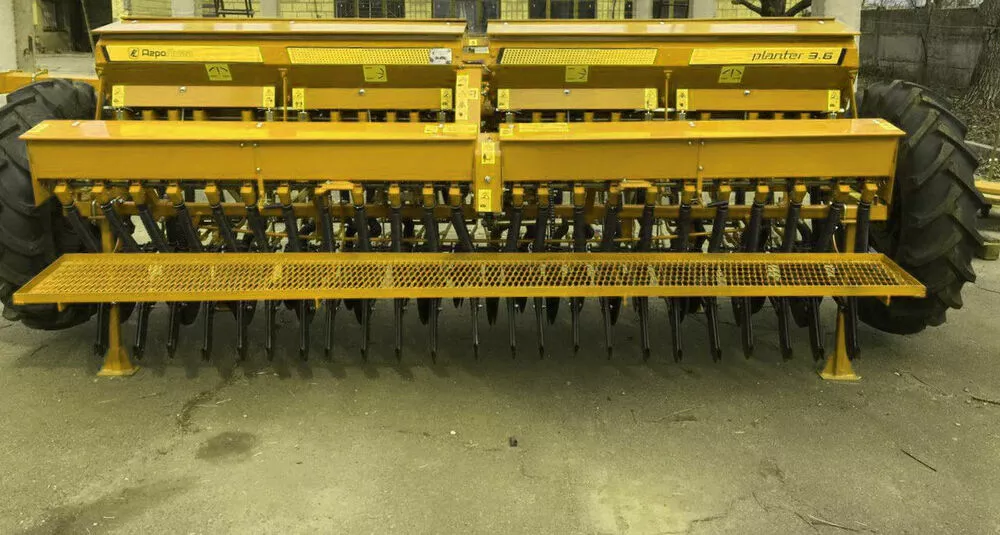Сеялка зерновая Planter 3.6 Т (СЗТ-3.6)Сеялка Planter-3.6 Т предназначена для рядового посева семян зерновых, зернобобовых культур как раздельно, так с одновременным посевом семян трав и внесением гранулированных минеральных удобрений. Используя основные бункера, можно проводить высев семян зернобобовых и зерновых культур через двух дисковые сошники. Аналогично можно осуществить высев и несыпучих и среднесыпучих семян трав.Норма высева семян задается за счет изменения передаточного числа в механизме передач, который имеет три основных положения. Шестерни механизма передач термически обработанные, что обеспечивает увеличение ресурса и надежность их работы. А также дополнительно задаются настройки рабочей длины катушки, регулированием рабочей ширины катушки, групповым регулированием клапана высевающего аппарата и сменой частоты вращения вала высевающего аппарата.Преимущества:Сошник двухдисковый рядовойДиск сошника изготовлен с борированой стали толщиной 3 мм, что после соответственной термообработки значительно повышает выносливость и увеличивает ресурс работы сеялки. Сошник обеспечивает разрезание пожнивных остатков и углубление дисков на заданную глубину, что значительно улучшает равномерность всходов. На сеялке установлены поводки сошников трубных конструкций, которые обеспечивают парное позиционирование сошников по продольному и горизонтальному расположению. Штанги крепления сошников изготовлены с металлопроката круглого (более жесткого)  пересечения с шарнирными соединениями регулирования давления на грунт и шарнирными соединениями, обеспечивает их надежность. Сошники наральниковыеСошники наральниковые крепятся поводками и кронштейнами к корпусам заднего ряда дисковых сошников. Шарнирное крепление поводков дает возможность сошникам легко поднимать­ся и опускаться в вертикальной плоскости. Для подъема сошников в транспортное по­ложение служат скобы поводков. К корпусу наральниковых сошников крепятся гофрированные семяпроводы. Через наральниковые сошники из травяных бункеров можно высевать сыпучие, но мелкие семена, например рапс, клевер или люцерну, также этим методом можно провести высев сыпучих семян трав, которые предназначены для покрова зерновых. Высевающий аппаратВысевающий аппарат зерновой сеялки оригинального использования имеет в себе гальванизированные металлические изделия (валы, корпуса и метисная группа). А благодаря металлокерамическим катушкам высевающий аппарат прослужит долго и не потеряет своего качества с годами. Высевающий ящик и рамаВысевающий ящик увеличен на 1000 дм3, что позволяет уменьшить количество остановок для загрузки агрегата. Рама сеялки имеет усиленную конструкцию, что исключает деформацию и разрушение. Ящик для семян травЯщики для семян трав по ходу сеялки уста­новлены на заднем брусе рамы. Ко дну ящика прикреплены катушечные травяные высевающие аппараты с групповой регулировкой норм высева, конструкция ко­торых аналогична зерновым высевающим аппаратам ящика зернотукового. ПружинаНа штанге амортизатора  установ
