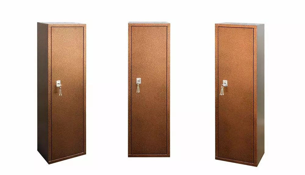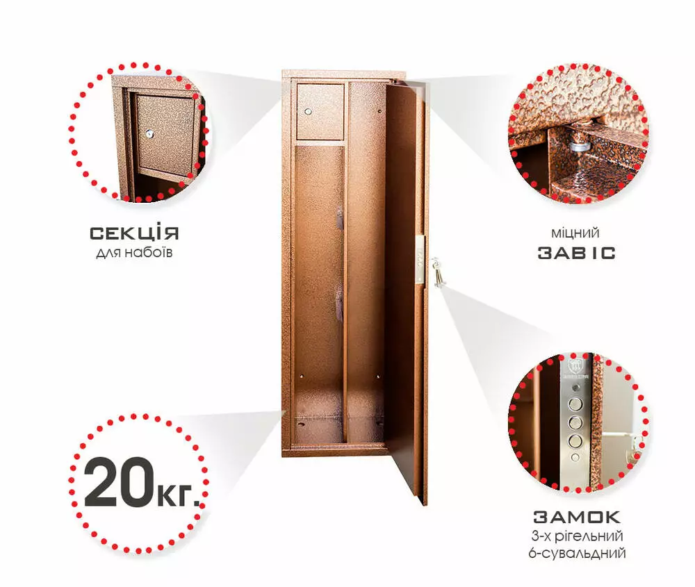 Призначений для зберігання мисливської зброї та набоїв до нього, засобів обслуговування тощо, від необережного користування кимось стороннім. Товщина металу 1,5мм, висотою 137см глибиною 25, та шириною 39см. Якісний ключовий замок від виробника Barrera 6-ти сувальдами, збереже вашу зброю від небажано доступу.