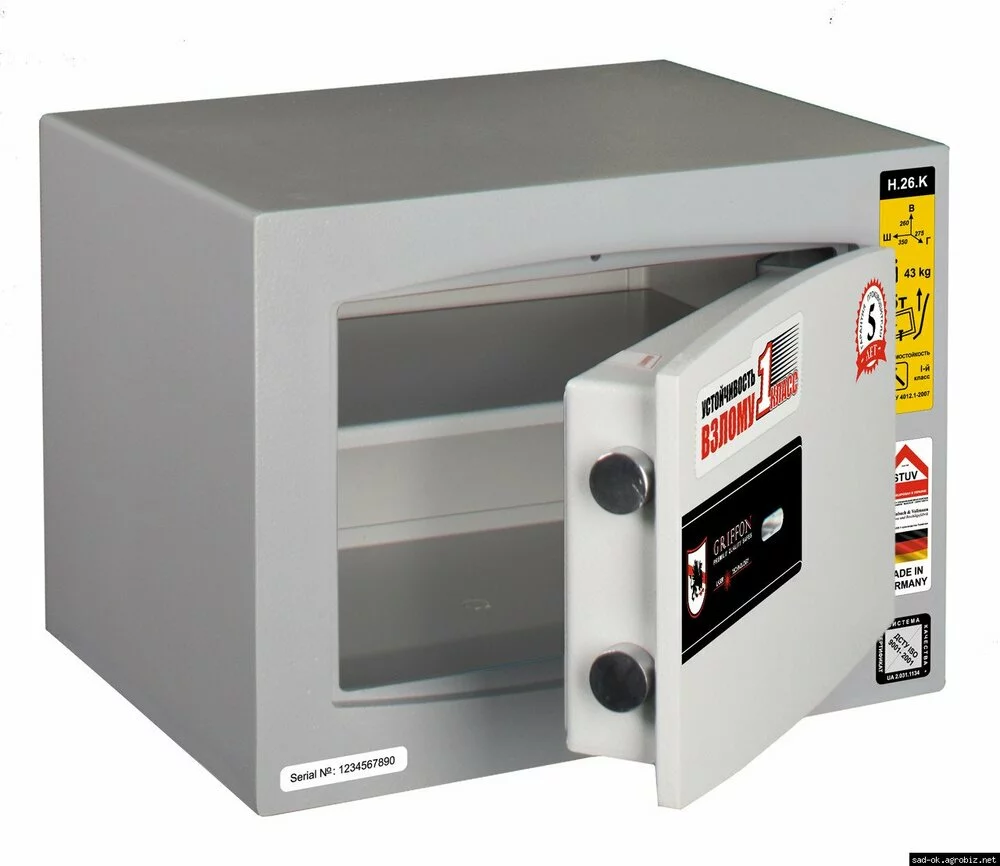 H.26.K – первый сейф из серии взломостойких сейфов компании Паритет-К, выпущенный под маркой Griffon. При своих достаточно небольших размерах сейф обладает впечатляющей стойкостью ко взлому. Повышенную прочность обеспечило применение бетонного заполнения двухстенной конструкции сейфа и толстой передней панели, выполненной из одного листа металла с помощью лазерной резки.