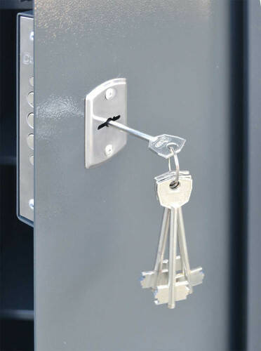 Сейф укомплектований сувальдним замком із трьома хромованими ригелями, в комплекті передбачено 3 ключі.