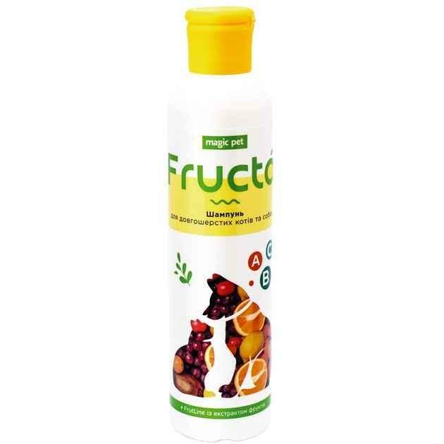 Magic Pet Fructa Розроблений спеціально для собак та котів з довгою шерстю. Шампунь ефективно очищує та зволожує шерсть, робить її шовковистою, надає блиску та сприяє легкому розчісуванню. Натуральні ягідні екстракти смородини, вишні, малини, винограду та вітаміни Е, А, D, В5 заспокійливо впливають на шкіру, пом’якшують шерсть та перешкоджають її сплутуванню.