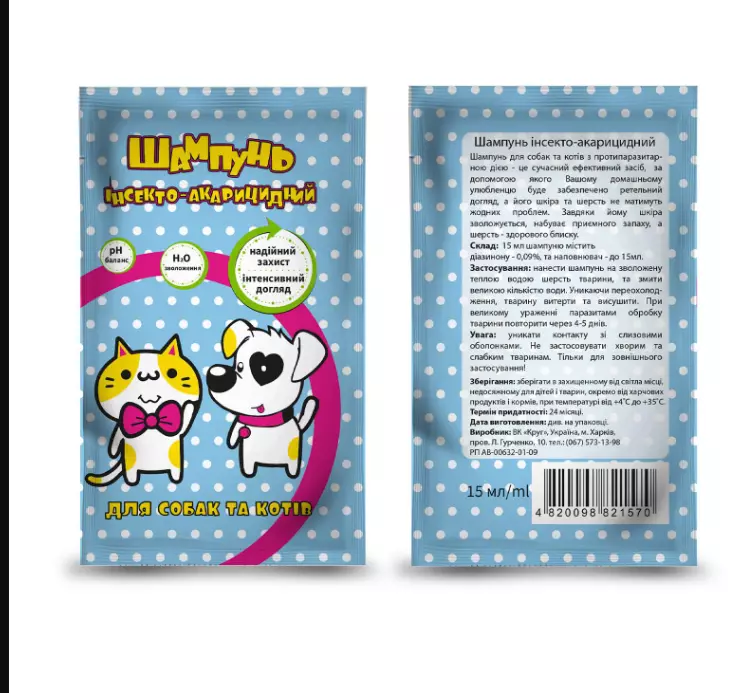 Шампунь інсектоакарицидний для собак і котів (15 мл) є сучасним ефективним гігієнічним засобом з протипаразитарною дією, за допомогою якого Вашому домашньому улюбленцю буде забезпечено ретельний догляд, а з його шкірою і шерстю не буде жодних проблем. Завдяки шампуню шкіра зволожується, набуває приємного запаху, а шерсть — здорового блиску.