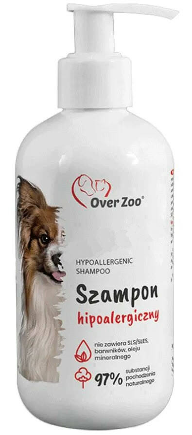 Over Zoo Hypoallergenic Shampoo - гіпоалергенний шампунь на основі натуральних компонентів для собак з будь-яким типом шерсті, який особливо підходить для вихованців із чутливою шкірою. Містить м'які миючі компоненти, що не подразнюють шкіру тварин, але ретельно очищують і забезпечують шкірі та шерсті відмінний догляд.