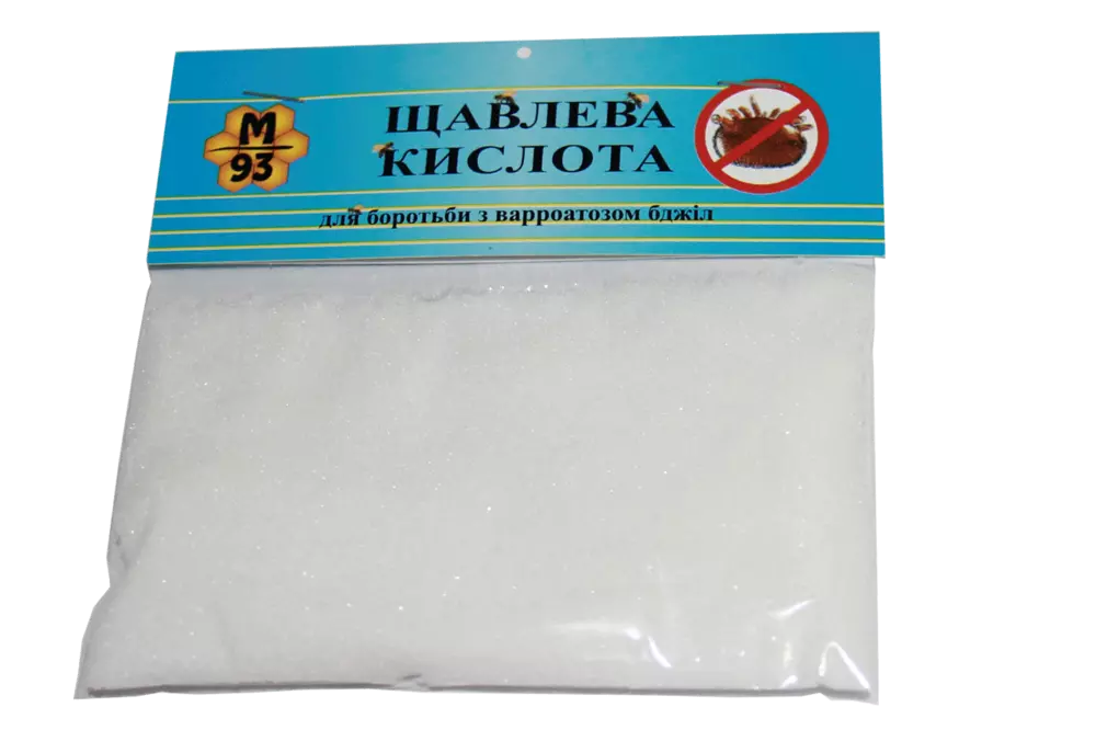 Для приготування 2% розчину щавлевої кислоти вміст 20 - грамового пакета розчиняють в 1 літрі теплої кип'яченої води. Обробляють міжрамковий простір улъев з допомогою обприскувача типу "Росинка', на відстані 25-30 см, під кутом 30-400 до рамок, з розрахунку 5-10 мл розчину на кожне міжрамковий простір. Обприскування проводять навесні триразово, з інтервалом в 1 тиждень, і восени, після збору меду, при температурі повітря не нижче +15 0С.