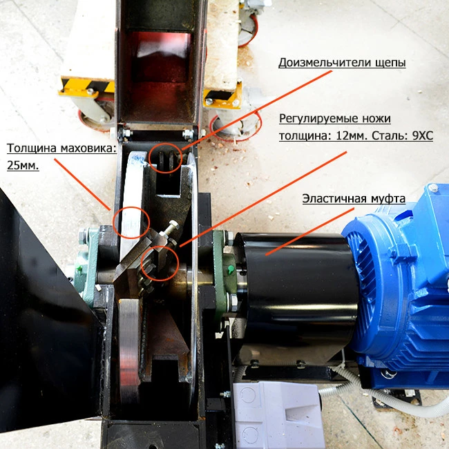 есть. Регулировка фракции щепы есть. Загрузочный раструб 290х290мм.