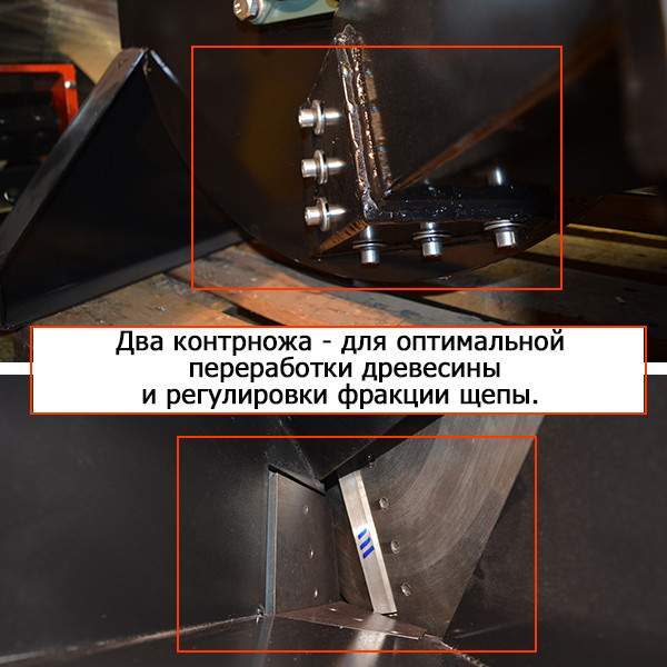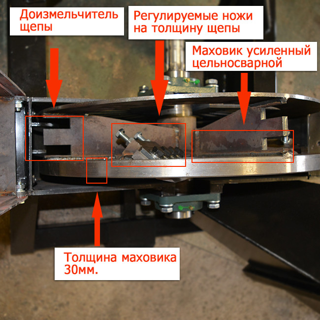 Данная модель щепореза 4М-130Т оснащен маховиком диаметром 600 мм и толщиной 30 мм. Количество ножей 4шт., толщина ножа 13мм. Ножи регулируемые, что очень важно для роботы щепореза и заточки ножей. Также щепорез оснащен двумя контр ножами, что позволяет полностью перерабатывать ветку в щепу. Данный вид щепы подходит для шнековой загрузки в котлы длительного горения.
