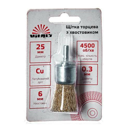 Щітка дискова з хвостовиком Vitals гофрована латунована, з діаметром 25 мм та діаметром проволоки 0,3 мм, призначена для обробки металевих та неметалевих конструкцій у важкодоступних місцях. Ось докладний опис цієї щітки: