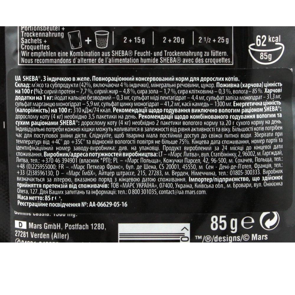 Коту масою тіла 3 kg (кг) необхідно 1½ пакетика вологого та 15 g (г) сухого корму на добу, коту масою тіла 4 kg (кг) необхідно 2 пакетики вологого та 15 g (г) сухого корму на добу, коту масою тіла 5 kg (кг) необхідно 2 пакетики вологого та 25 g (г) сухого корму на добу. Ми рекомендуємо змішаний раціон годування вологим кормом SHEBA® та сухим кормом. Слідкуйте, щоб тварина мала постійний доступ до свіжої питної води. Годувати кормом кімнатної температури.
