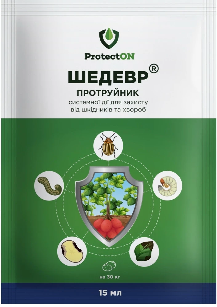 Шедевр  протравник бульб картоплі інсектицидно-фунгіцидної дії. Надійно захищає полуни та молоді рослини картоплі від гризунів і шкідників із колюще-смоктувальним ротовим апаратом, зокрема від ґрунтових шкідників, хворобходів.
