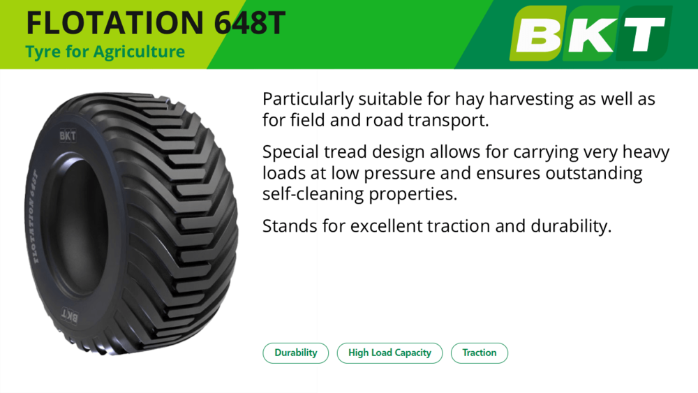 Шина 385/65-22.5 BKT FLOTATION 648 широко використовується на бункерах-перевантажувачах невеликої та середньої місткості, зернових перевантажувальних причепах і допоміжній аграрній техніці. Завдяки флотаційному малюнку протектора вона забезпечує мінімальний тиск на ґрунт, стабільність під навантаженням і хорошу прохідність у польових умовах.