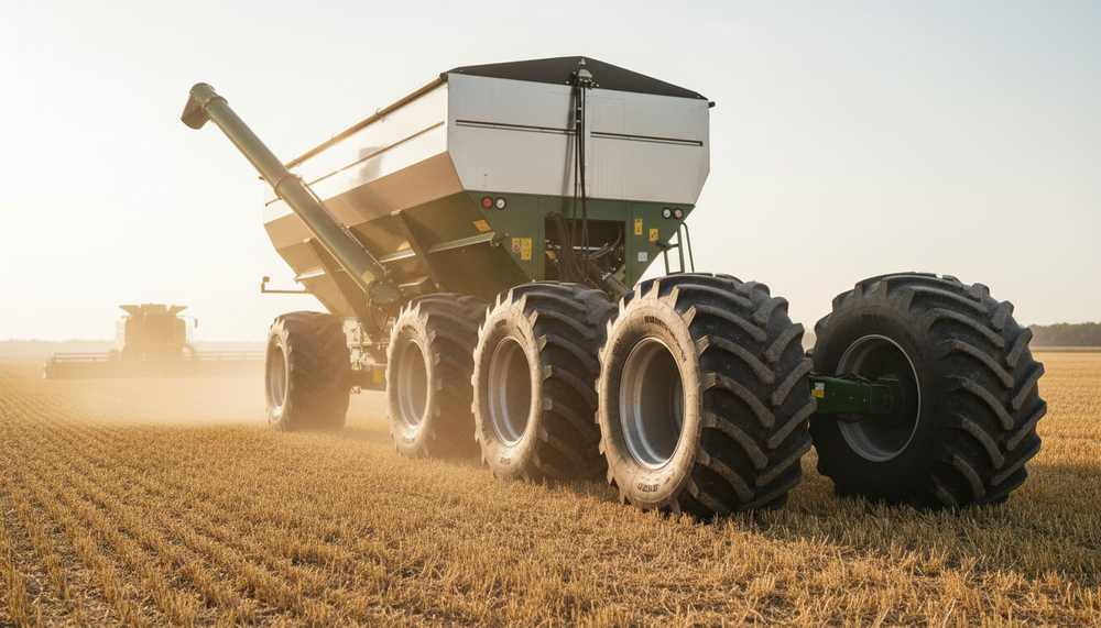 Конструкція шини дозволяє працювати з великими обсягами зерна під час збирання врожаю, знижуючи ущільнення ґрунту та підвищуючи ефективність логістики в полі.