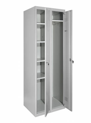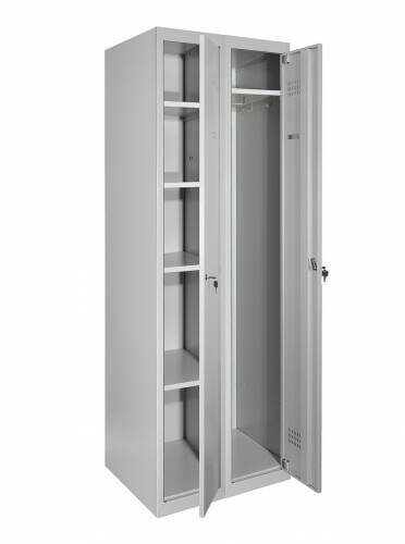 Матеріал: Метал, Покриття: Полімерно-порошкове, Конструкція: Збірно-розбірна, Товщина металу 0.5 мм, Тип шафи: Господарський (ШГМ), Кількість секцій: 2, Кількість дверей у секції: 1 Ліва секція -, Кількість відділень: 5 з можливістю регулювання висоти полиць